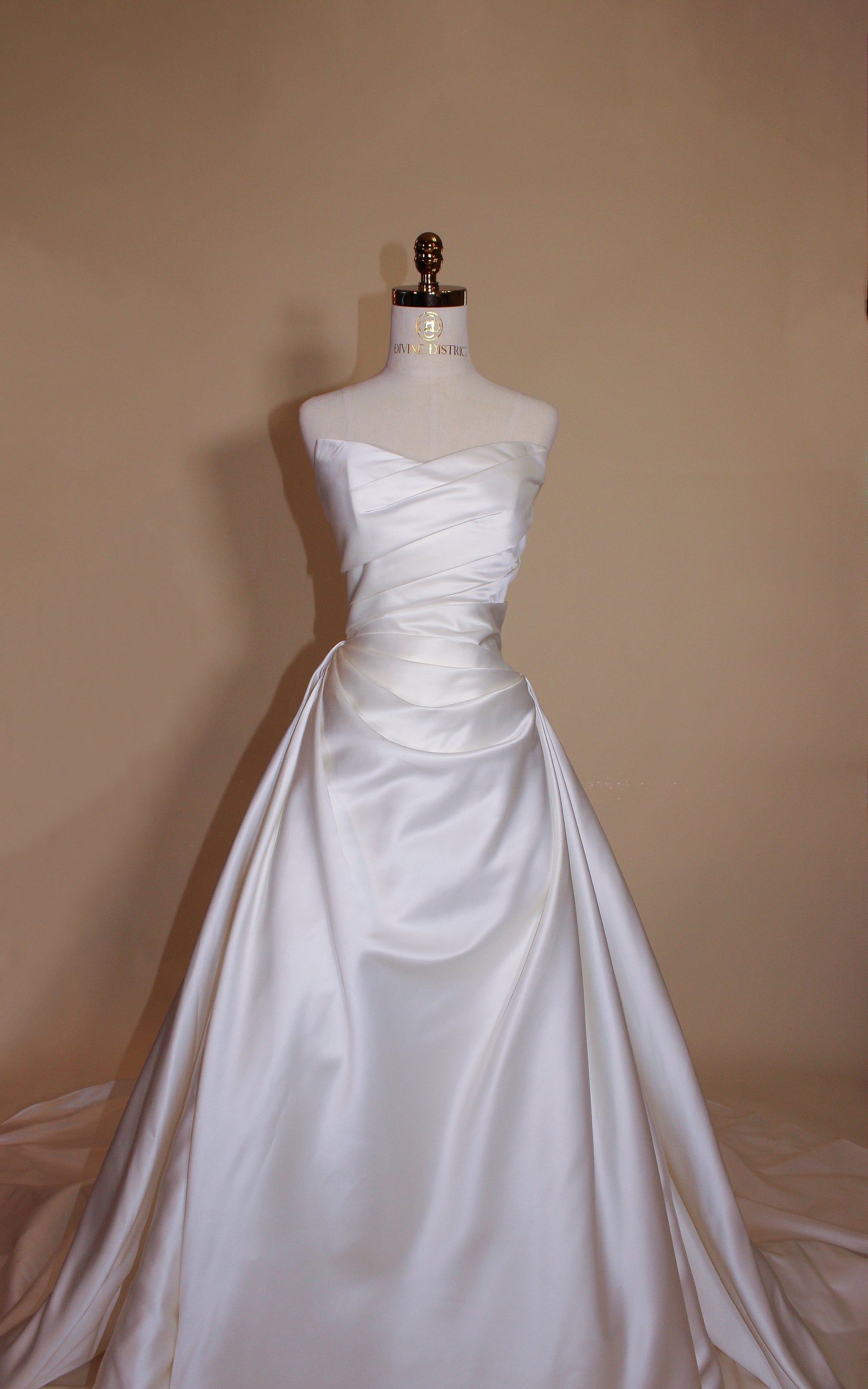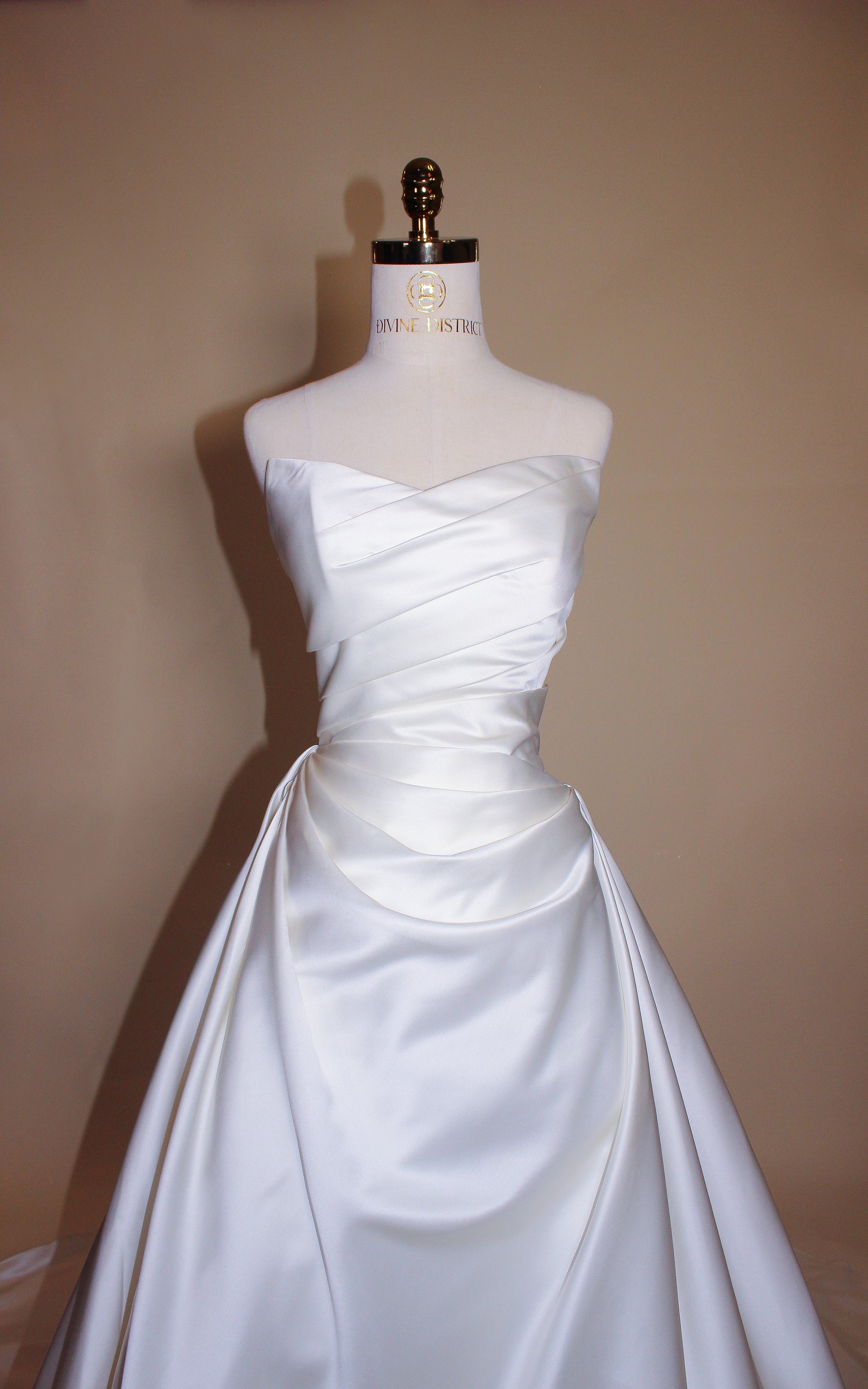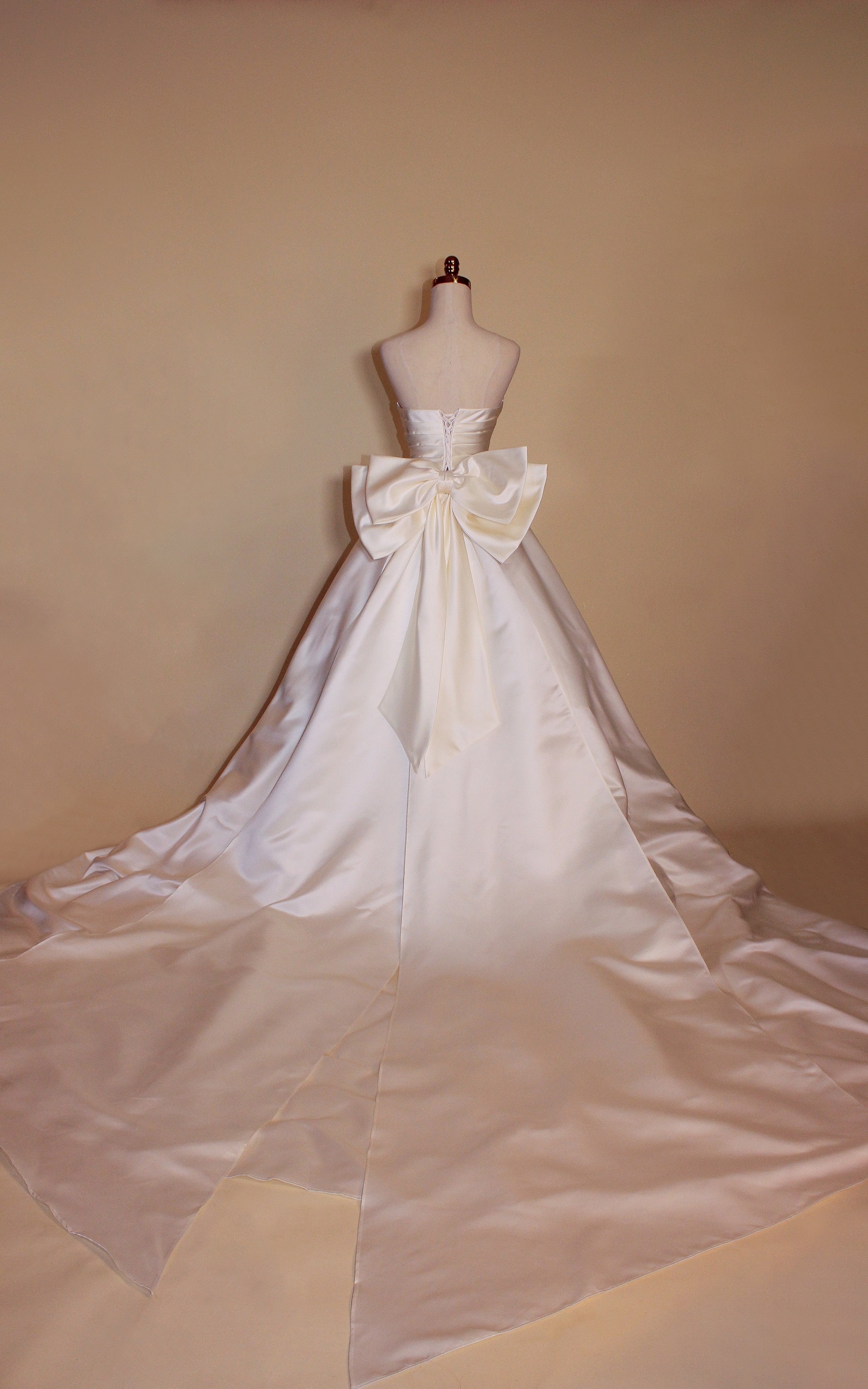 Our Annabelle dress is crafted from luxurious créme satin giving a soft, elegant sheen. The bodice is fitted with delicate draping along the waistline that will contour your figure in the most graceful form. The back of the dress features a large, beautiful bow with a long, trailing ribbon that will surely make a statement on your wedding day.
