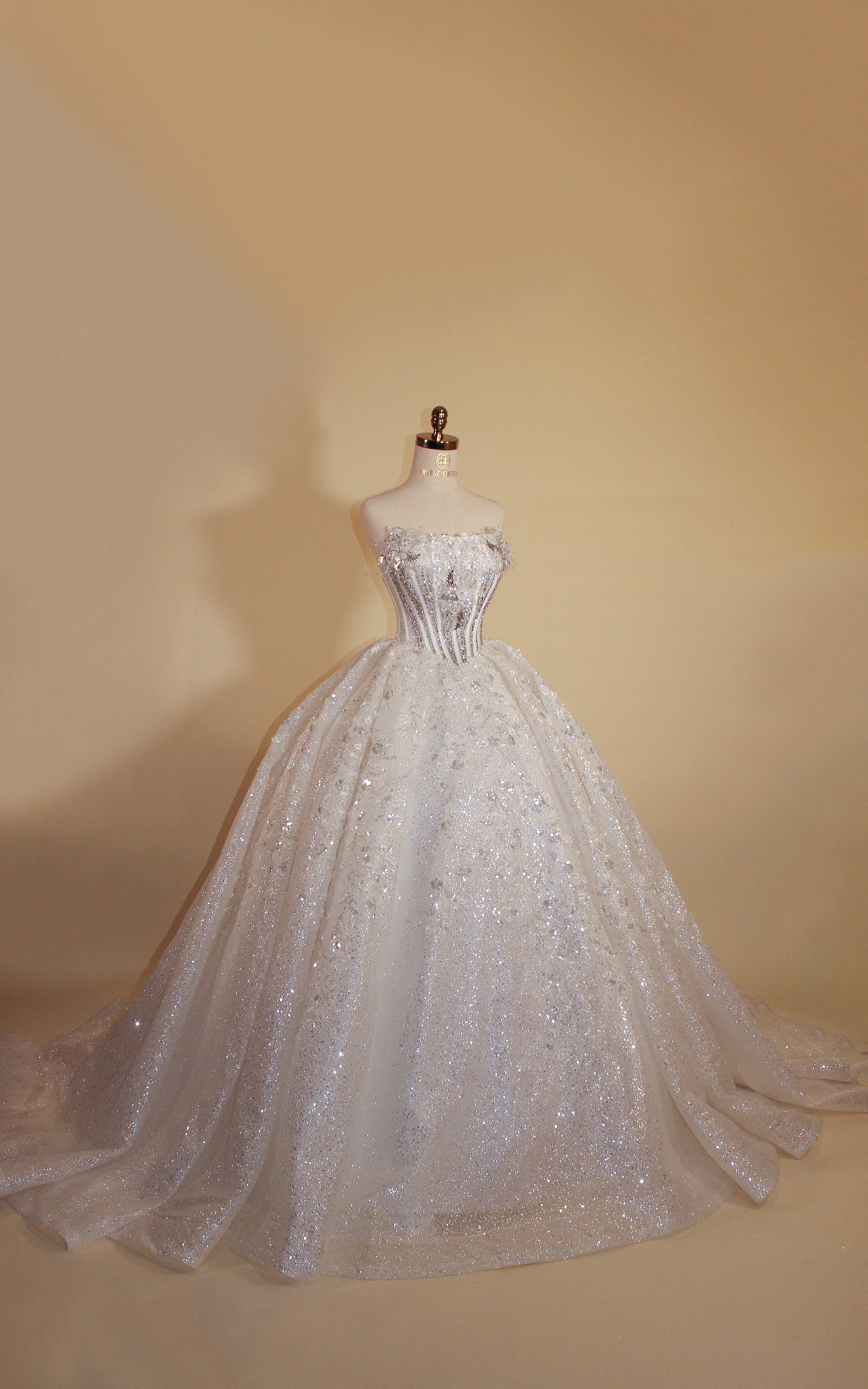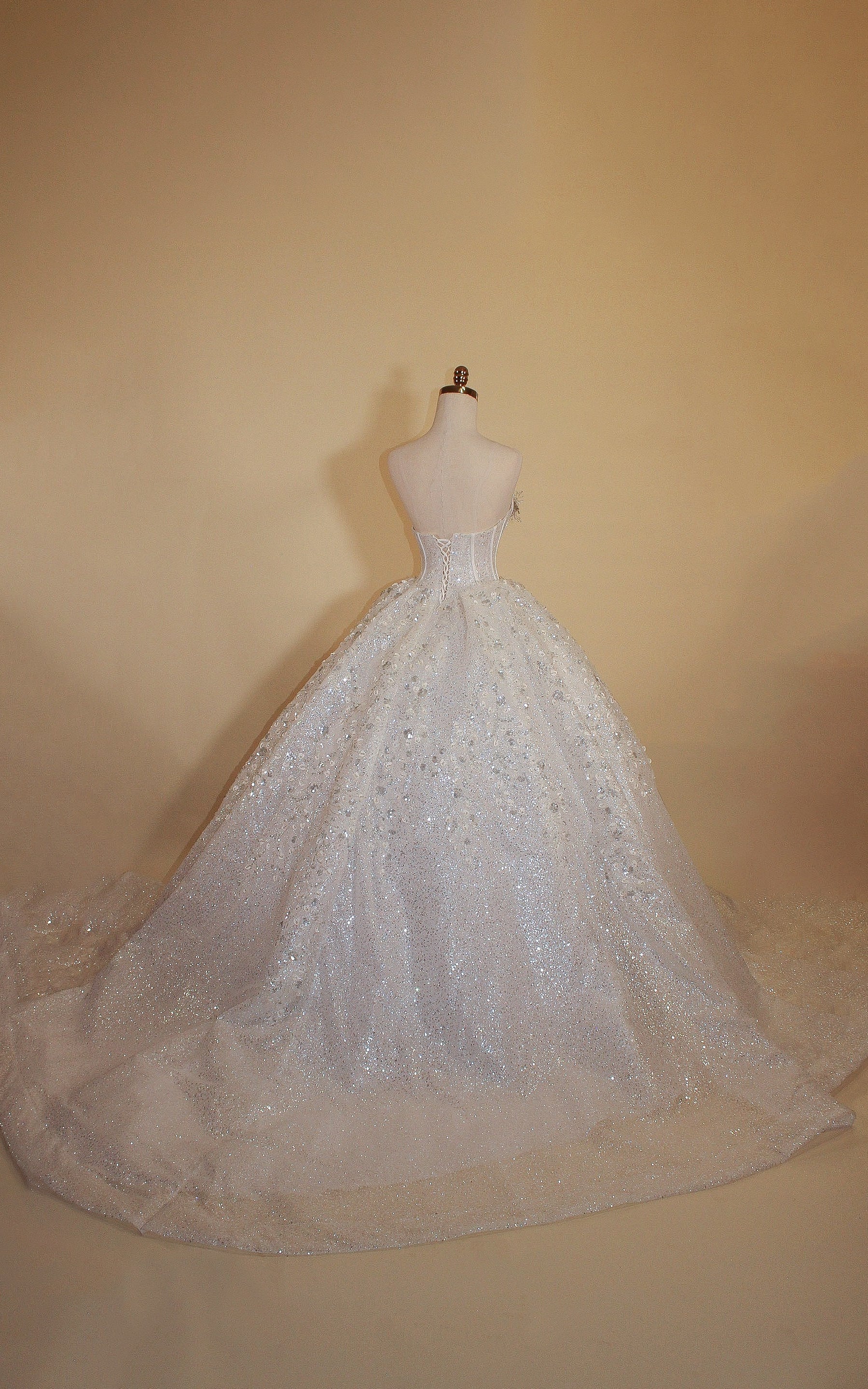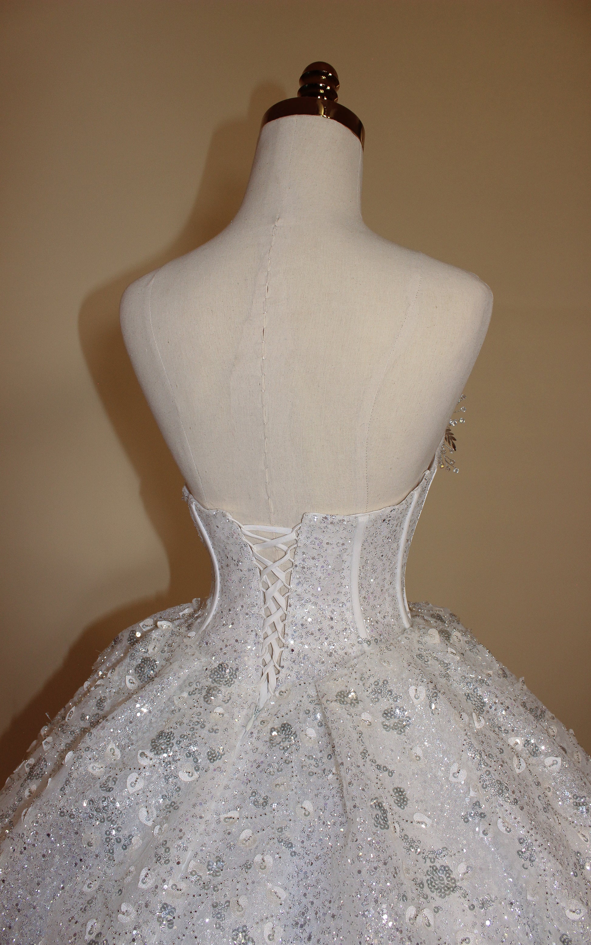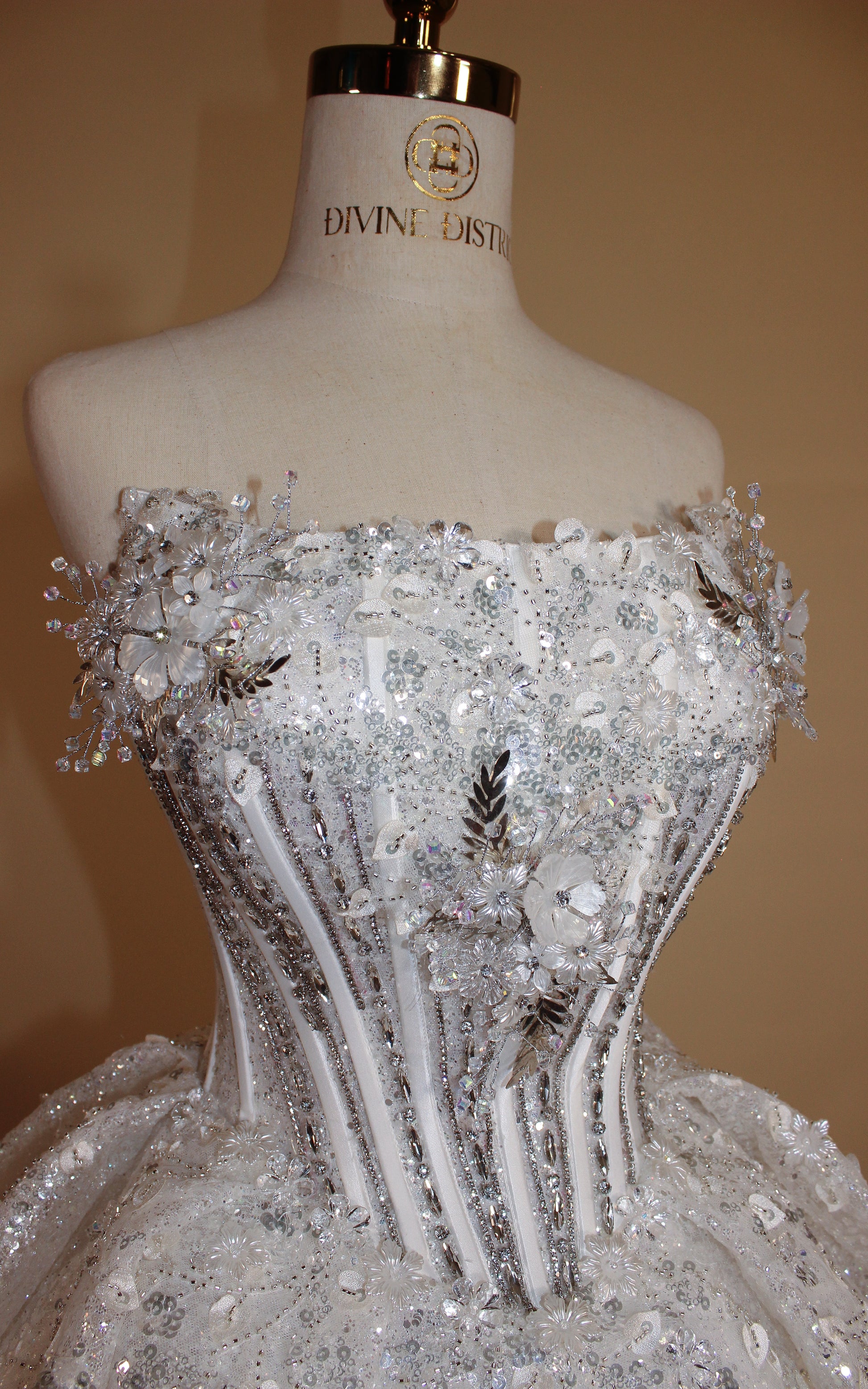 Our Evelynn ball gown features a fitted corset bodice lined with shimmering diamonds which can both enhance and highlight your figure. The bodice is covered in a beautiful array of flowers and vines creating an enchanting garden-like appearance that will undeniably give you a whimsical and magical effect.