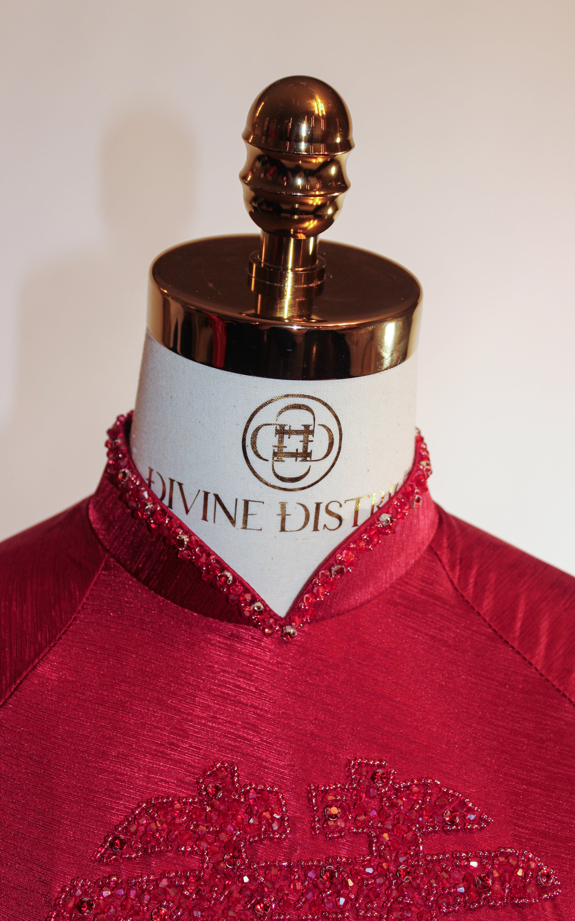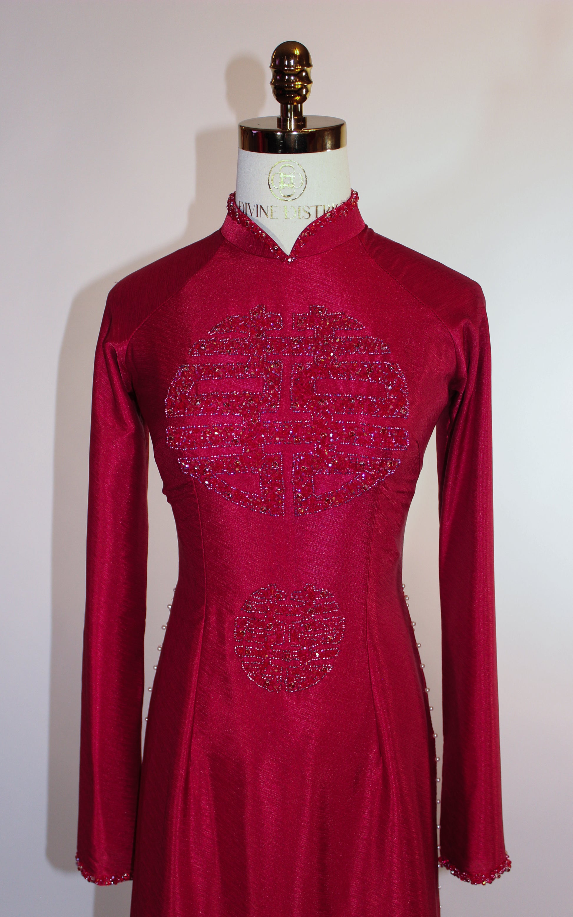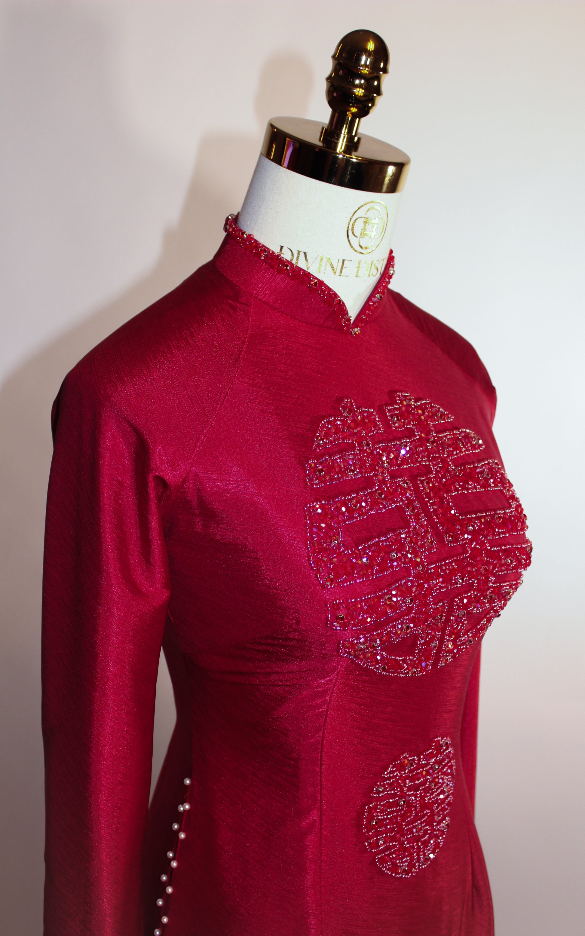 This ao dai is a vibrant scarlet, adorned with intricate red diamonds embellishments cascading along the neckline and delicately placed on the chest, adding a touch of elegance and magnificence to the traditional Vietnamese dress.