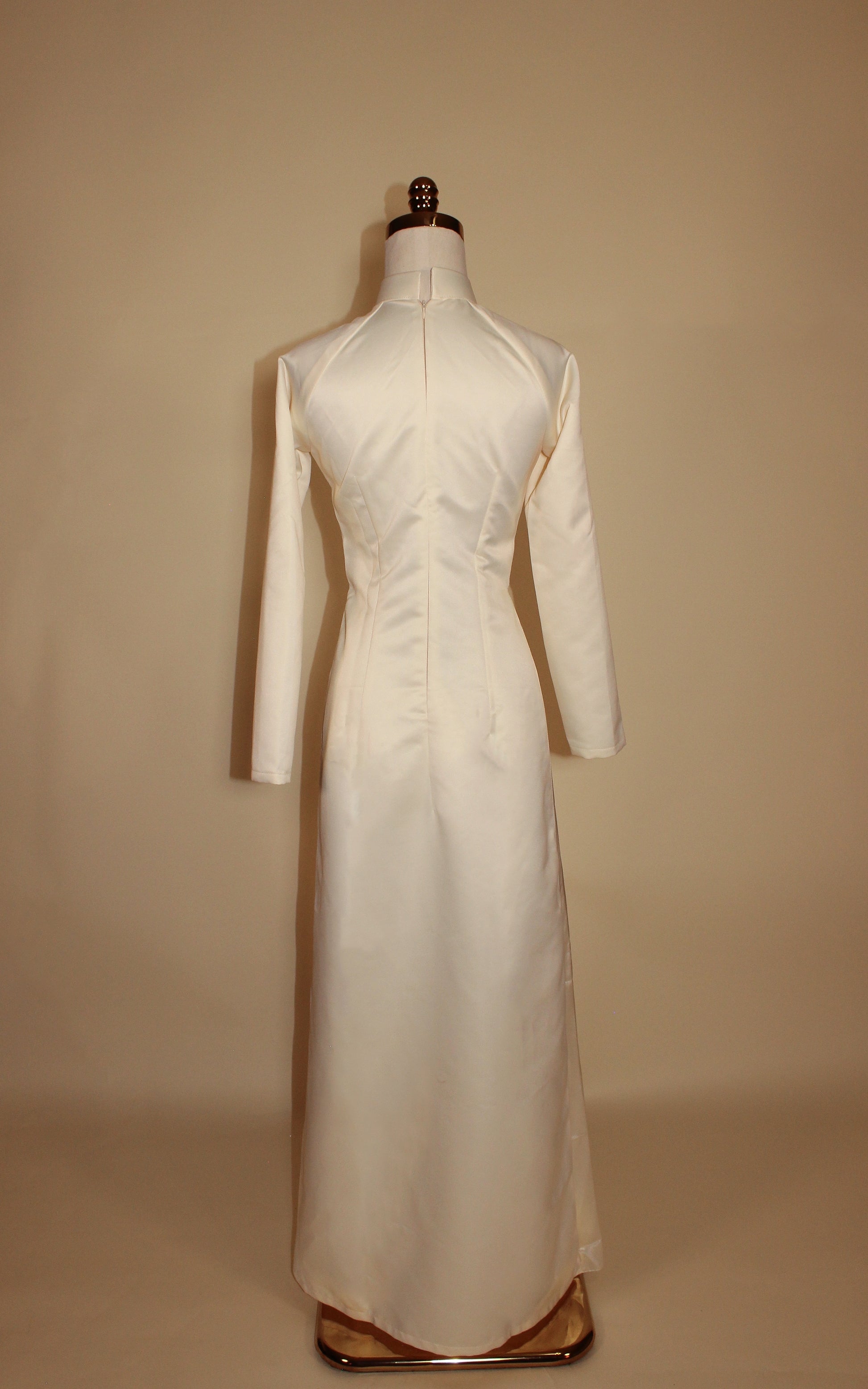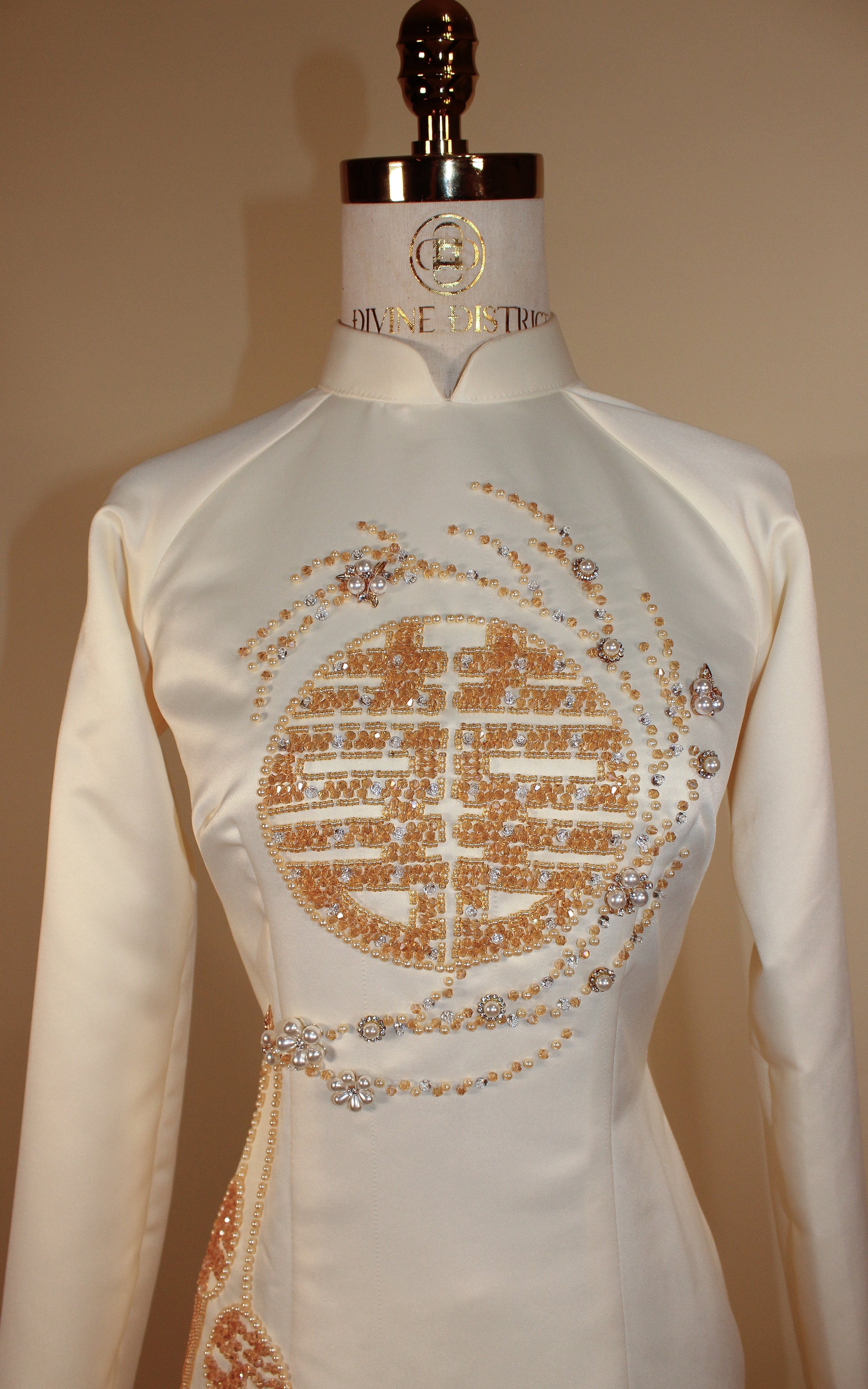 Our Leanna ao dai is a beautifully crafted piece that merges traditional gracefulness with luxurious embellishments. This silky cream ao dai, embellished with delicate pearl florals and the double happiness symbol, is a masterpiece that truly embodies the essence of Vietnamese elegance.
