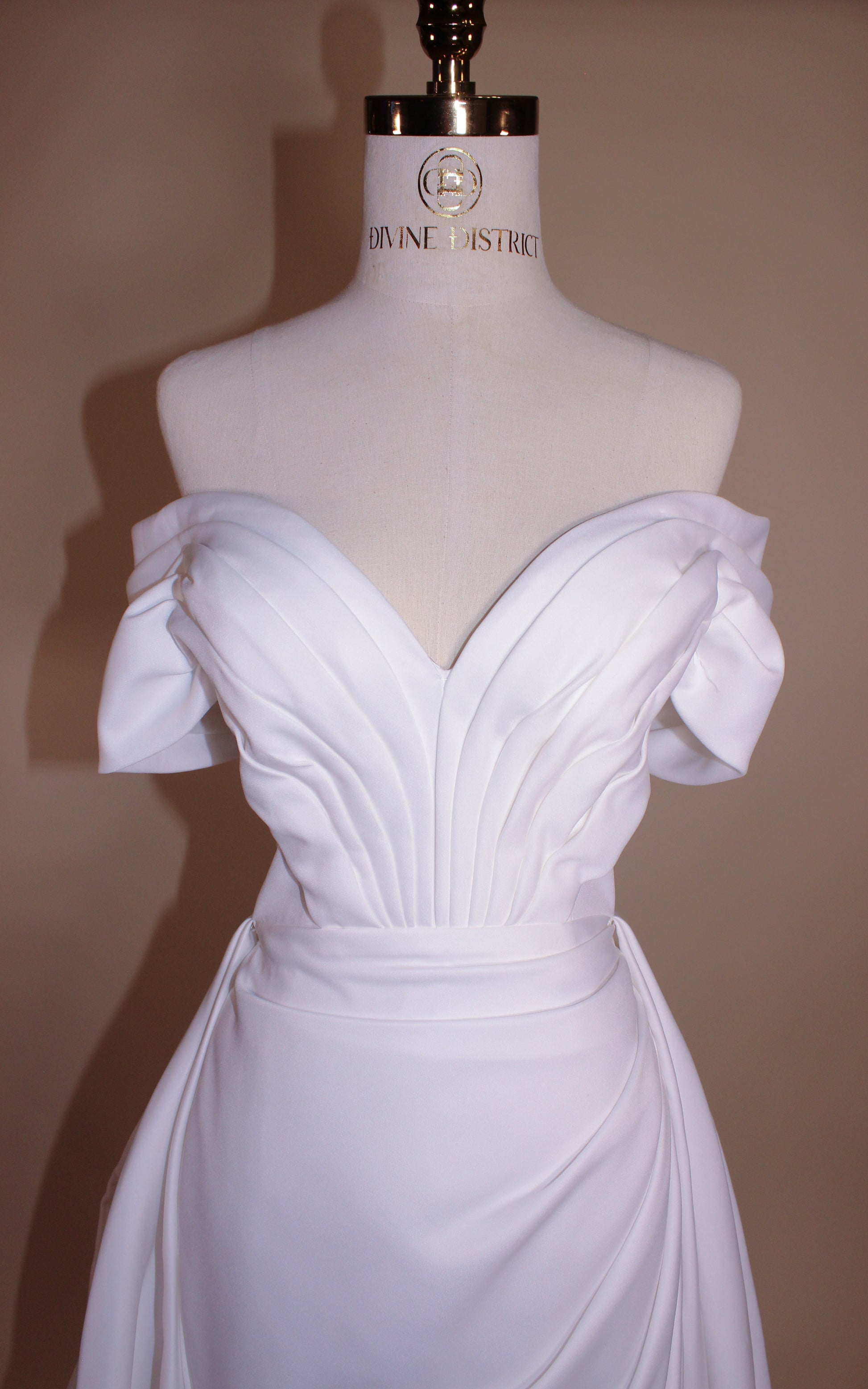 Our Sophine gown is off the shoulder, creating a romantic neckline that emphasize the collarbones and shoulders beautifully. The front of the dress features pleated detailing that adds a visual interest to the bodice. Flowing from the waist, the dress extends into a dramatic train that will ensure an unforgettable entrance and presence.